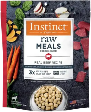 Instinct Freeze-Dried Raw Meals are formulated for dogs that thrive on a high-protein, meat-forward diet. These recipes typically contain 85% or more real meat and organs, making them an excellent choice for active dogs, working breeds, and dogs with higher energy needs.